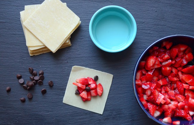 3. Working with one wonton wrapper at a time, place a heaping teaspoon full of the strawberry mix in the center of the wrapper. Add several chocolate chips on top of the strawberries. Wet your finger in a small bowl of water and use it to dampen all four edges of the wrapper. Bring two opposite corners of the wrapper up to meet one another and press them tightly together to seal, then bring the remaining two corners of the wrapper up to meet the first point. Squeeze seams along the four edges to seal completely and set dumpling aside. Work quickly so wrappers don't dry out.